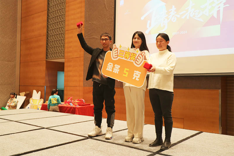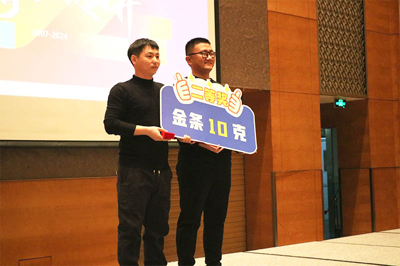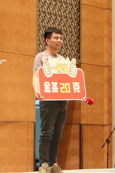 隨著(zhù)三等獎的抽出,晚會(huì )氣氛達到一個(gè)小高潮。幸運兒們滿(mǎn)心歡喜地領(lǐng)取了獎品5克金條。